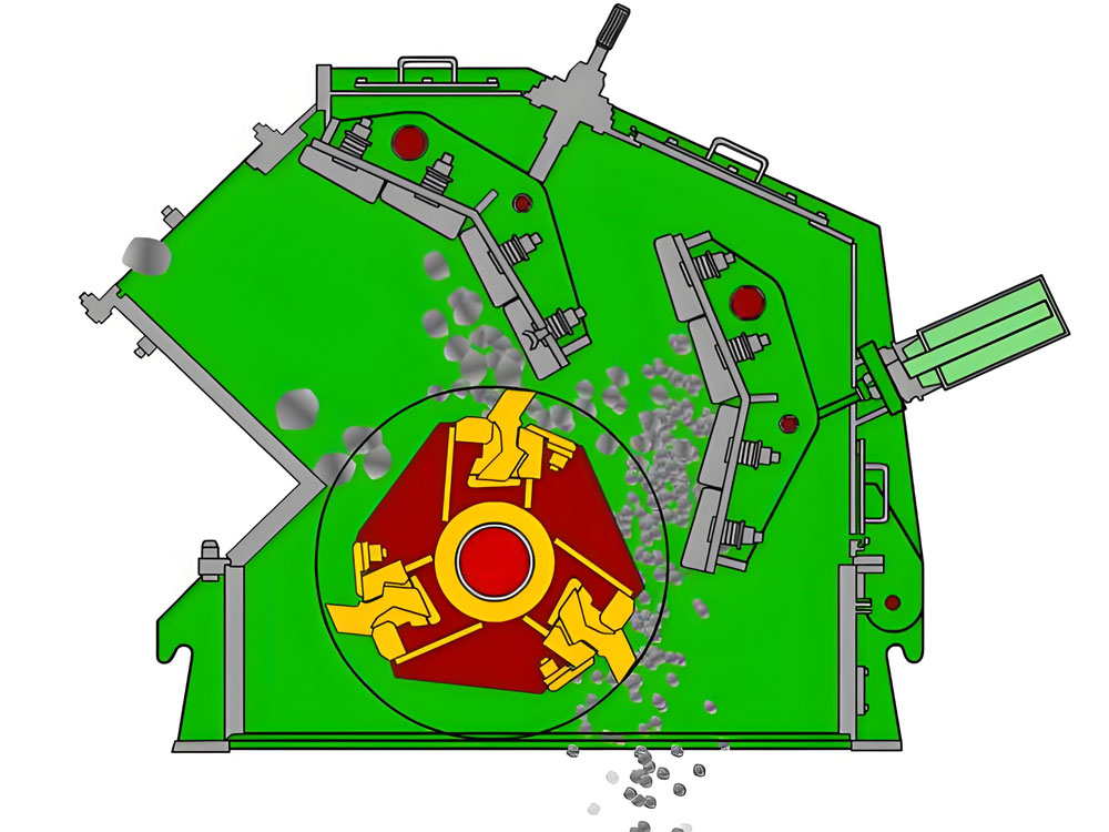Après être entré dans la chambre de concassage depuis le port d'alimentation, le matériau est d'abord frappé par le rotor à grande vitesse (équipé de marteaux à haute dureté), puis broyé en particules grossières et jeté sur la plaque de contre-attaque, puis heurté avec la plaque de contre-attaque, puis à nouveau heurté avec les matériaux ou les marteaux suivants. Après être entrés en collision avec la plaque d'impact, les matériaux projetés rebondiront vers la zone du rotor et entreront à nouveau en collision avec les matériaux ou les marteaux suivants, formant des impacts répétés et réalisant un concassage en plusieurs étapes. L'écart entre la plaque d'impact et le rotor peut être ajusté par le système hydraulique : plus l'écart est petit, plus les matériaux recevront d'impacts et plus la granularité des matériaux déchargés sera fine (par exemple 0-40 mm) ; plus l'écart est grand, plus les matériaux déchargés seront fins. Plus l'écart est petit, plus le matériau reçoit d'impacts, plus la granularité est fine (par exemple 0-40 mm) ; Lorsque l'écart est augmenté, le nombre de matériaux écrasés est réduit et la granularité du matériau déchargé devient plus épaisse (par exemple 40-70 mm). La surface de la plaque d'impact est conçue comme pliée ou incurvée, ce qui améliore l'angle de collision du matériau et améliore l'efficacité de broyage.) La partie dure continue d'être écrasée dans le cycle, formant finalement des particules cubiques uniformes, réduisant la proportion de matériaux en flocons d'aiguilles, les matériaux qui atteignent la taille cible sont déchargés par l'orifice de décharge inférieur et les particules qui ne répondent pas à la norme continuent de rester dans la chambre de broyage pour être écrasées dans le cycle.