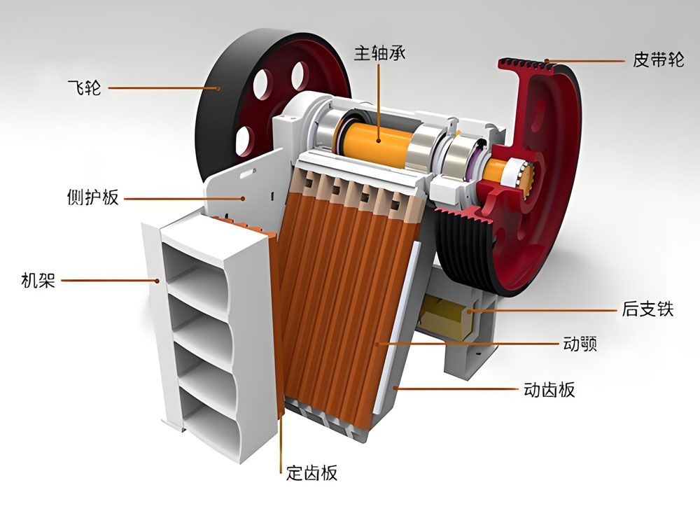 Le moteur entraîne l'arbre excentrique par l'intermédiaire d'une poulie, qui entraîne la mâchoire mobile (plaque mobile) suspendue à son extrémité supérieure pour une oscillation elliptique. Son extrémité inférieure est articulée à la paroi arrière du châssis par l'intermédiaire d'une plaque de poussée. La partie supérieure de la mâchoire mobile présente une course importante (7-8 cm) qui concasse les matériaux par extrusion puissante ; la partie inférieure, une course plus courte (1-2 cm), combinée à un broyage haute fréquence, affine les particules, créant ainsi un effet de broyage combiné par extrusion, fendage et pliage.