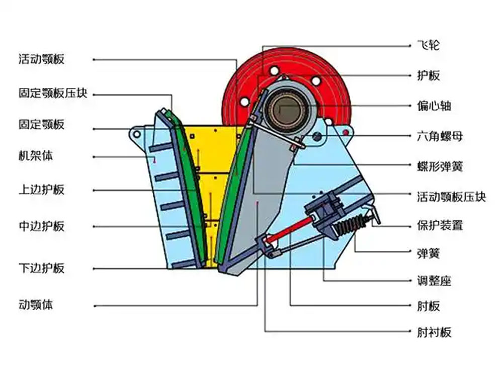 Pendant le mouvement descendant de la plaque à mâchoires mobile, le matériau est placé dans la cavité de concassage et soumis à la forte pression de compression entre la plaque à mâchoires fixe et la plaque à mâchoires mobile. Au fur et à mesure que la plaque à mâchoires mobile continue de se déplacer vers le bas, la fente entre les deux plaques à mâchoires se rétrécit progressivement et la pression sur le matériau augmente progressivement jusqu'à ce qu'il dépasse sa résistance portante et s'écrase.