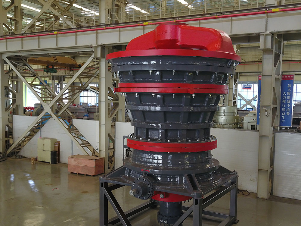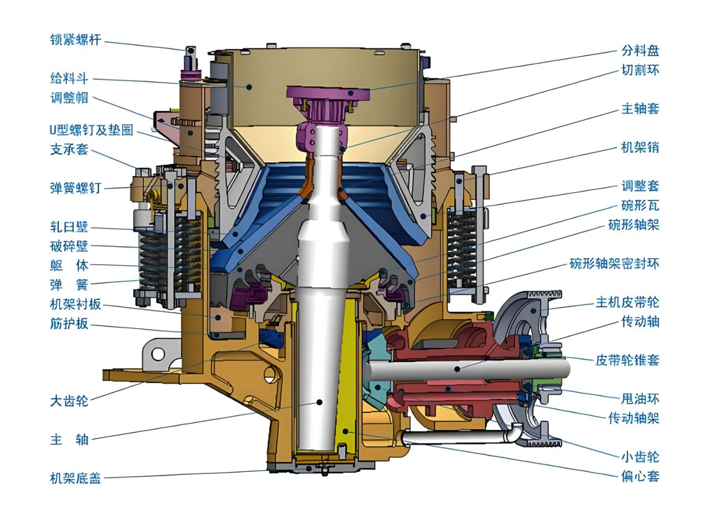La coopération entre le cône mobile et le revêtement fixe forme une chambre de concassage progressive, où le matériau est concassé progressivement de haut en bas jusqu'à la granulométrie souhaitée. Dans ce procédé, l'extrémité supérieure de l'arbre principal est soutenue de manière stable par la bague de la traverse, tandis que l'extrémité inférieure est étroitement reliée au système d'entraînement hydraulique par un manchon excentrique afin d'assurer la stabilité de la puissance de sortie et d'éviter efficacement les vibrations anormales de l'arbre principal.